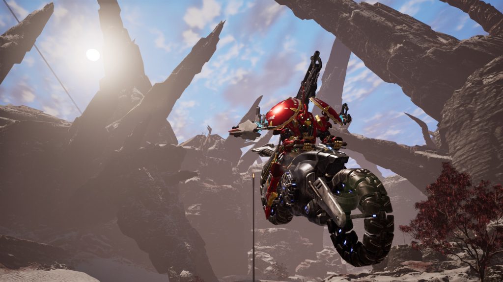 Later in the game, you unlock a motorcycle that becomes a go-to traversal method. Spawnable at any outpost, it’s incredibly fast and agile, zipping through biomes with ease. But its real trick is transforming into a powerful rail gun for devastating ranged blasts. The only downside is that it comes with a massive cooldown, so missing a shot leaves you wide open. Overall, it’s a playground that rewards exploration, with something to do tucked into every corner.