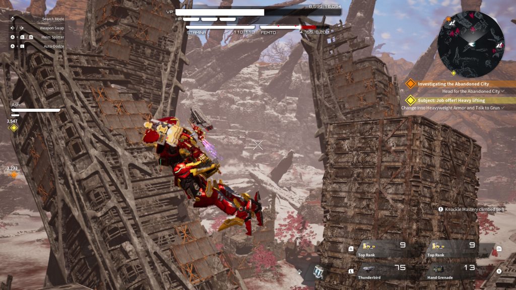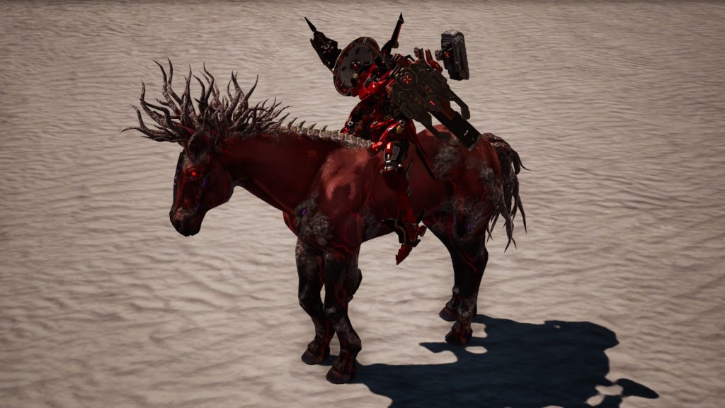 Traversal is a blast, with options to run, boost slide, or fly through the world, though these drain your stamina and Femto gauges. Breaking Femto crystals refills the latter, and pausing boosts recovers the former. Marvelous seems to have thrown in every wild idea they had, and I love it. Even if some feel unnecessary, they add charm. Although it’s a mech game, they have Halo Warthog-style vehicles scattered across the map that you can drive. They’re speedy, control well, and are just overall fun to take for a spin. Even weirder is that they added rideable horse-like Immortals in the world. Seeing a power suit galloping across the desert is absurd, but awesome even if it’s not essential.
