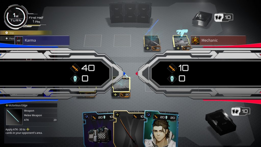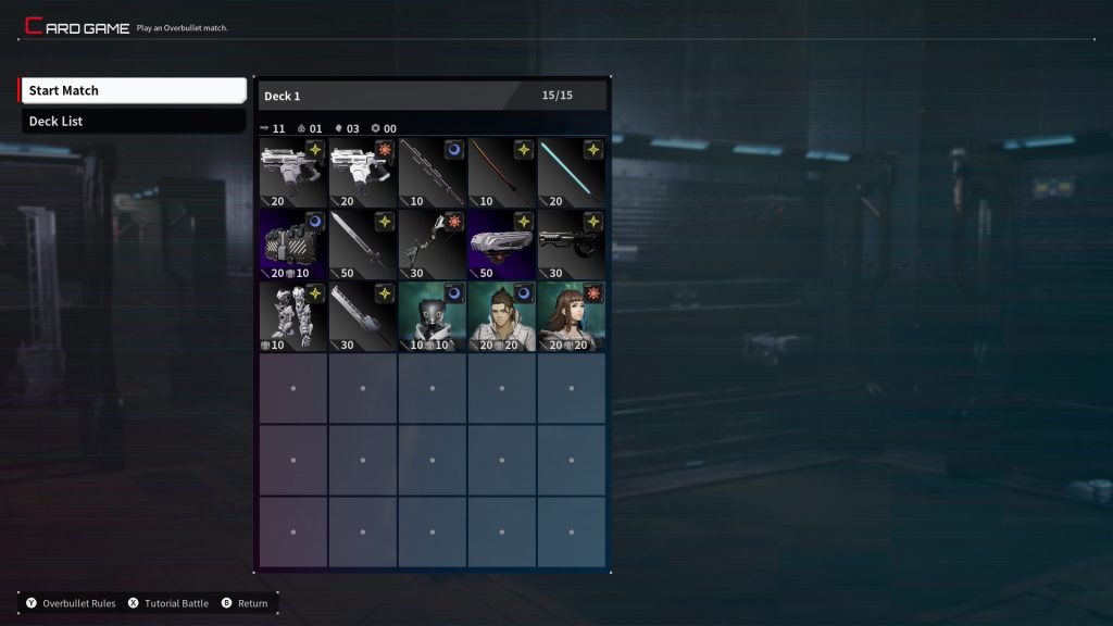 But the real surprise is Overbullet, a strategic card game that provides a welcome breather from the mech action. You collect cards throughout the game inspired directly from weapons, armor, and characters in Titanic Scion. You have a deck of 15 cards and battle NPCs in round-based duels. The goal? Deal the most damage per round to win five rounds and claim victory. Cards feature attack, defense, or both, reminiscent of something like Yu-Gi-Oh! The cards are also divided into three elements: sun, moon, and star.