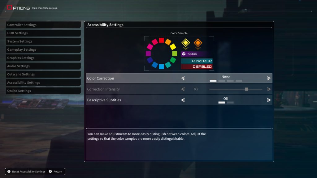 Daemon X Machina: Titanic Scion‘s accessibility isn’t the best or worst I’ve seen. It has options like color correction for colorblind players and descriptive subtitles that detail audio cues and environmental sounds. There are also extensive camera and controller settings, including full button mapping, allowing you to tweak sensitivity, invert axes, or remap controls entirely to fit your playstyle or needs.